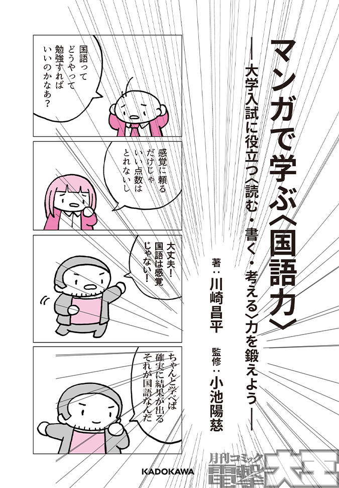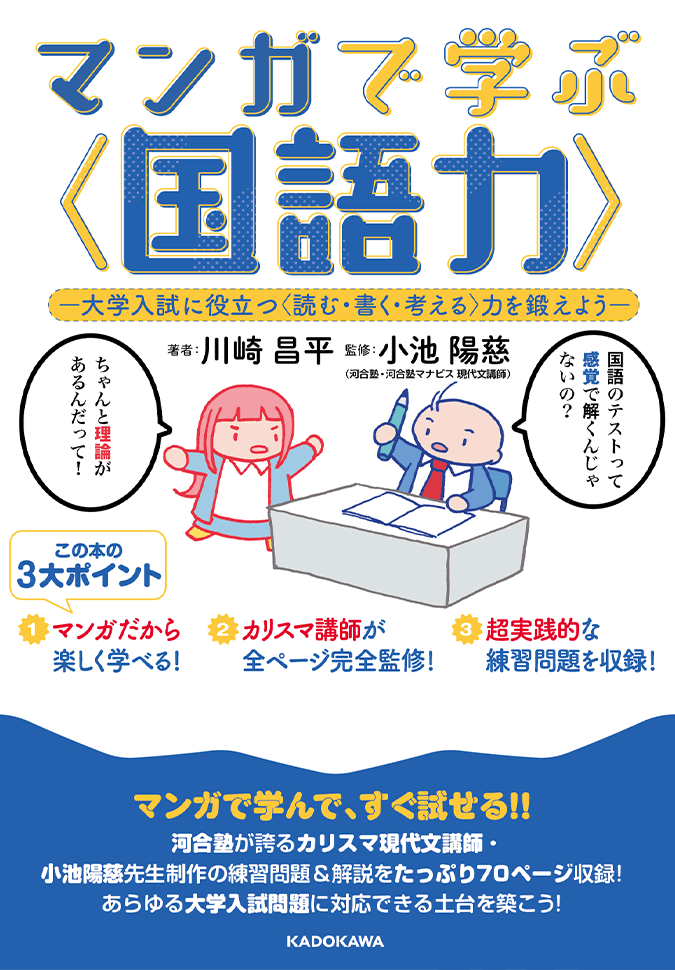 そうはいっても、川崎先生ってアカデミック系の人でしょ? 受験国語に詳しいのかな……と疑っていらっしゃる方、ご安心ください。本書は全ページ、河合塾が誇るカリスマ現代文講師・小池陽慈先生が監修しています!! 小池先生といえばKADOKAWA・中経出版レーベルから刊行された『小池陽慈の現代文読解が面白いほどできる基礎ドリル』『大学入学共通テスト 国語[現代文]予想問題集』の著者にして、河合塾が誇る現代文指導のプロフェッショナル講師! まさに受験国語の超専門家です。文章のプロ×受験国語のプロがタッグを組んでお贈りする本書に死角はありません!! 大学受験で良い結果を残したいと願う高校生全員に、自信をもってオススメできる参考書です。