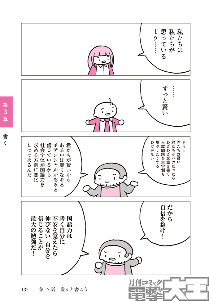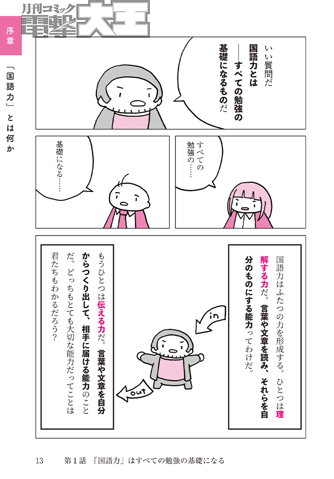 でも大丈夫! 本書は「国語力」を構成する3つの要素「読む」「考える」「書く」ことそれぞれの力をどう鍛えるべきか、明確なアンサーを示してくれます。たとえ現時点で国語力が低くても(中学校や高校での定期テストでヒドい点数をとっていたとしても!)問題ありません。「マンガで学ぶ〈国語力〉」は、一生モノの国語力をゼロから学べる1冊ですから!! 長い文章が苦手でも、マンガなら気楽に読めるでしょう。高校の現代文をちょっとでも「難しい」と感じた方は、絶対手にとってくださいね。