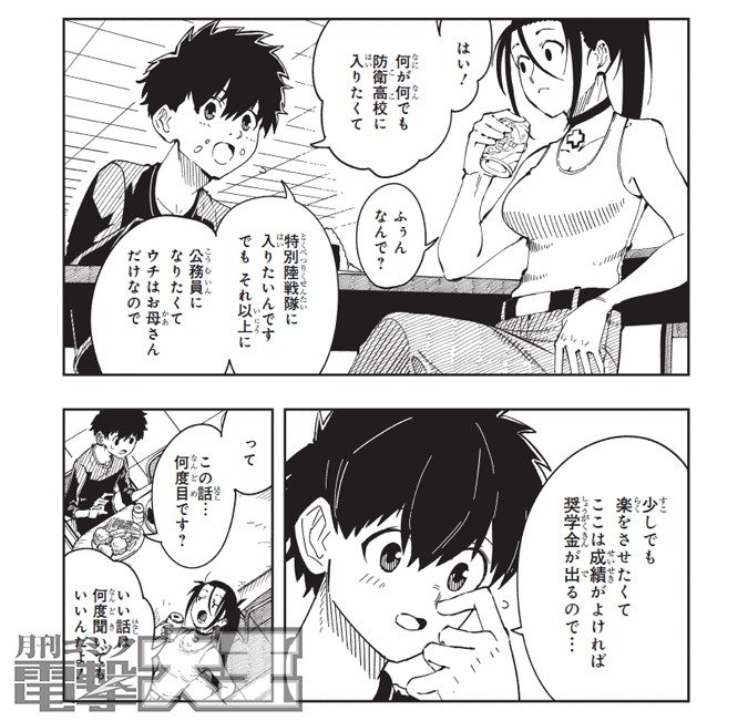赤は「特戦隊」隊員の養成学校「防衛高校」への入学を目指し、アルバイトと受験勉強に日々励んでいました。ある夜、赤は一年生の天才少女・伽耶村美耶子が何者かに襲われているのを目撃し、助けに入るも謎の注射針を打ち込まれてしまいます。そして次の瞬間、赤は異形の姿となっていて……!?