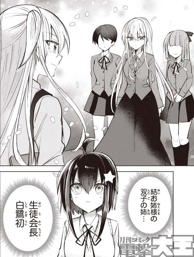 すがらと結の前に現れた、完全無欠の生徒会長・白鷺初。結と瓜二つな外見と、その苗字が示す通り、初と結は双子の姉妹にあたります。人を寄せつけないクールな言動の初ですが、一方で的確に事務仕事を処理していく姿から生徒たちの尊敬を集めています。